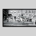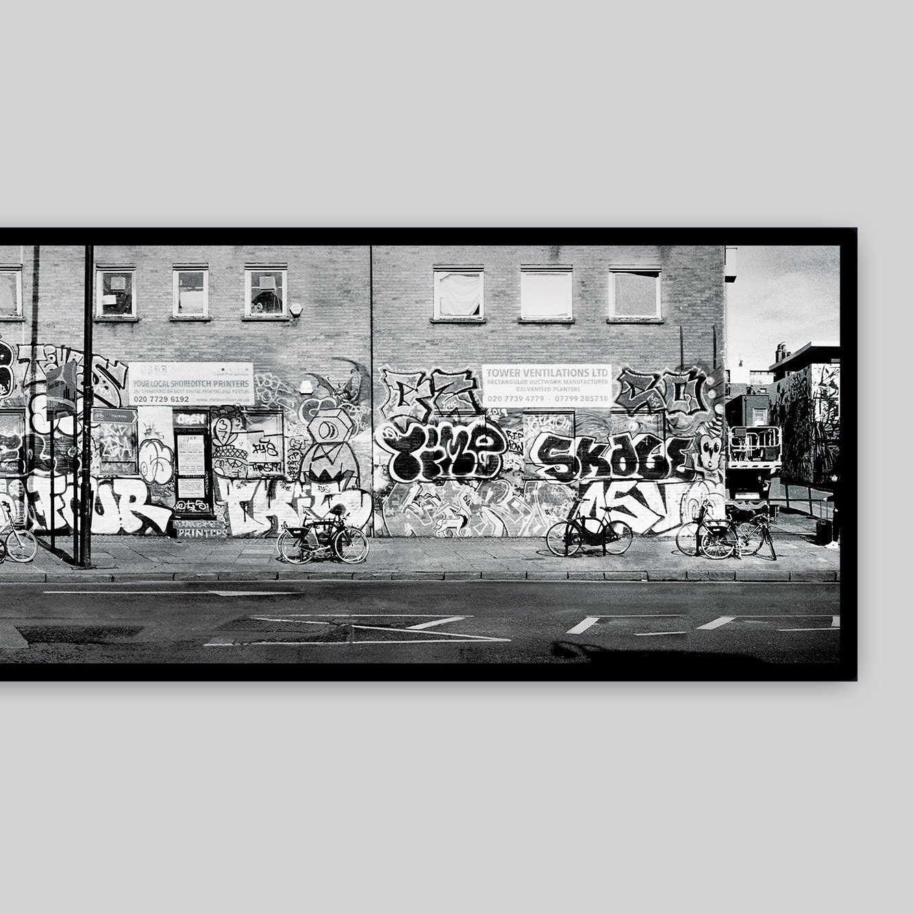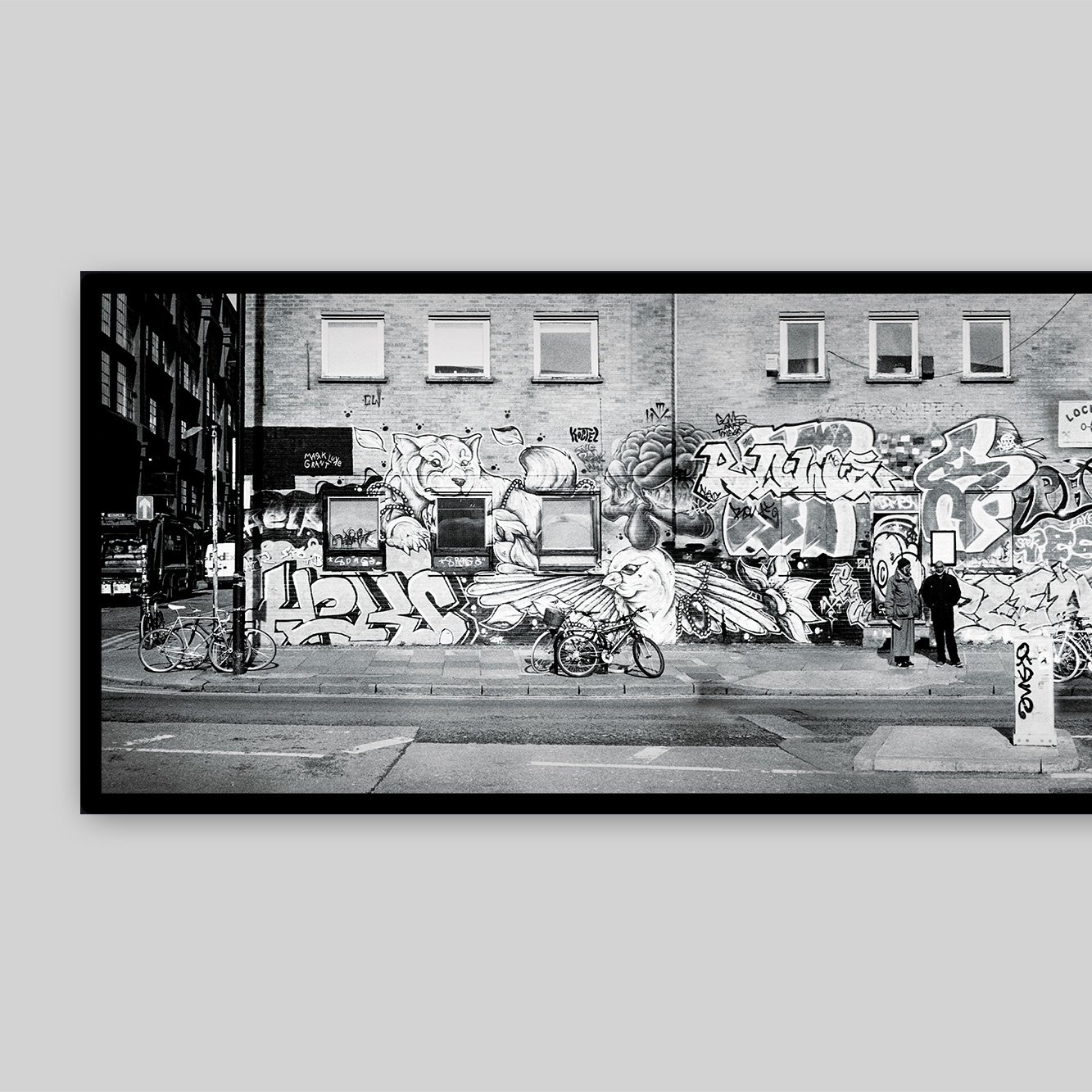 Taken on Bethnal Green Road just outside Shoreditch High Street Station on 35mm, Ilford Xp-4, black & white film. This piece is a result of 5 images carefully pieced together.